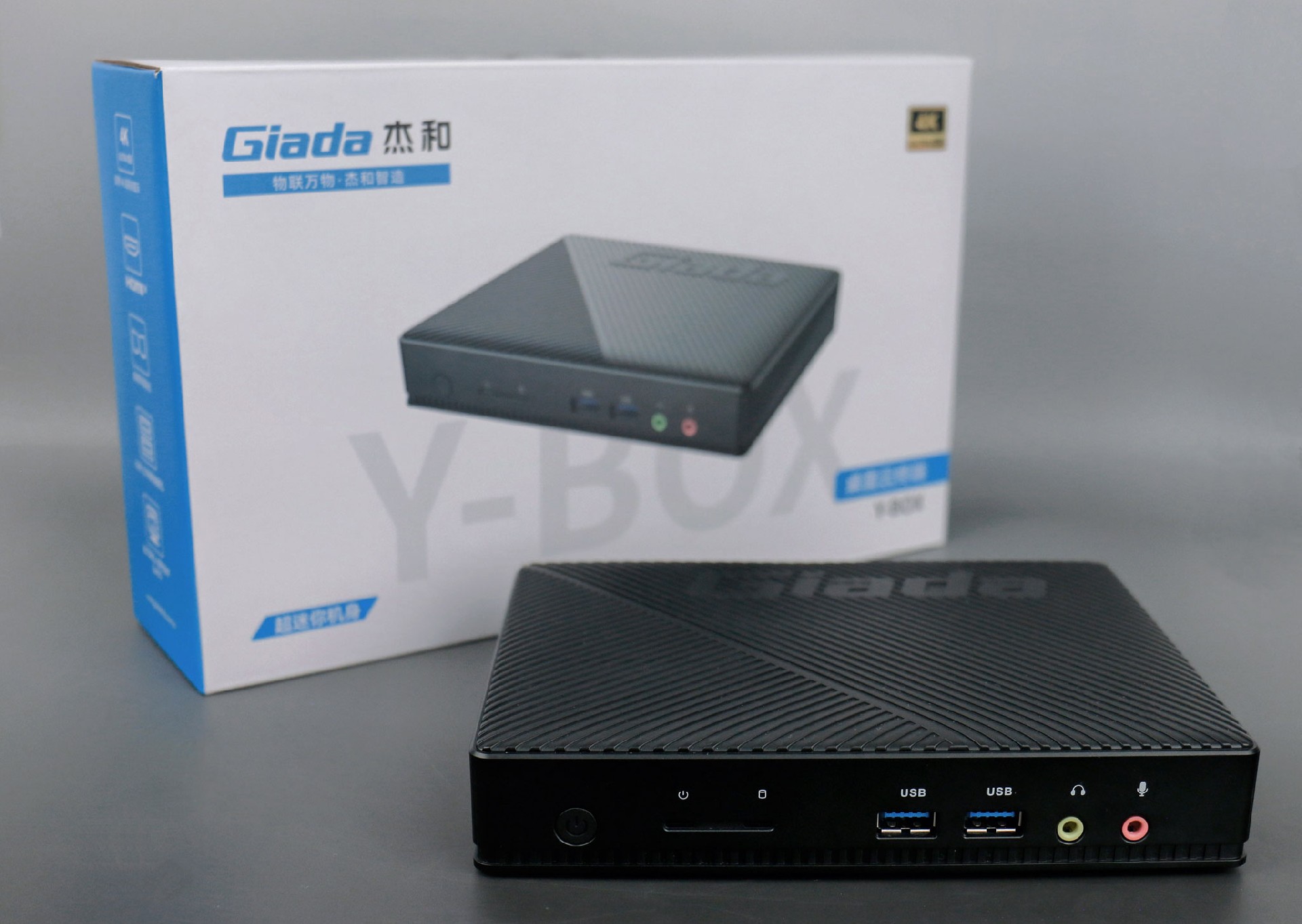 杰和桌面云終端Y-BOX S2采用全新外觀ID設計,主蓋采用黑色啞光柵格,頂部刻印杰和Giada品牌名,磨砂塑膠材質,高質感更輕盈。外包裝采用簡潔商務的風格設計,以杰和藍的配色作為點綴,內部采用嚴實防震的珍珠泡棉保護主機,同時,內部配備適配器、AC線、天線棒、螺絲包,滿足通用需求。