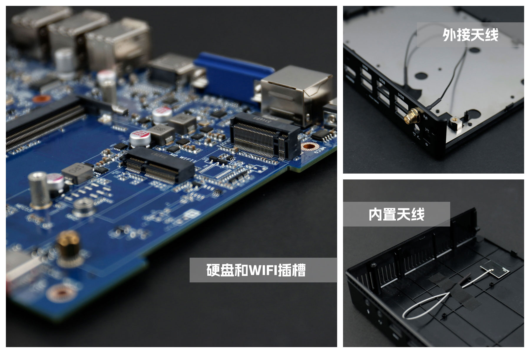 杰和桌面云終端Y-BOX S2主板上配備了 1個 M.2 固態硬盤位,接口規格為 PCIe3.0 標準,匹配標準的 2280 規格硬盤。一側還有一個M.2接口,匹配2230長度的WIFI/BT模塊插槽,WiFi模塊可以連接的是外接天線,增強信號,同時也可以內接天線,靈活應用,支持Wi-Fi 5/6/6E網絡。