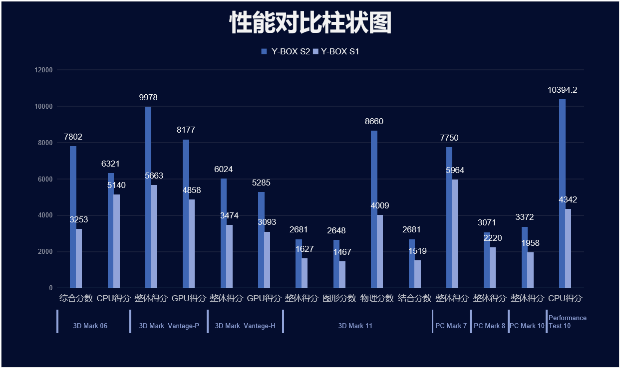 我們來具體看看各個測試項目的跑分情況,測試項目包括顯示性能測試、系統性能測試、CPU性能測試,分別用3D Mark、PC Mark以及Performance 10等系列不同軟件的跑分數據,針對兩款主板的跑分情況可以看出,杰和桌面云終端Y-BOX S2的數據在各項性能上都得到了大幅度提升,柱狀圖能更直觀地體現出數據的變化,我們將針對具體的幾項數據來進行詳細分析。