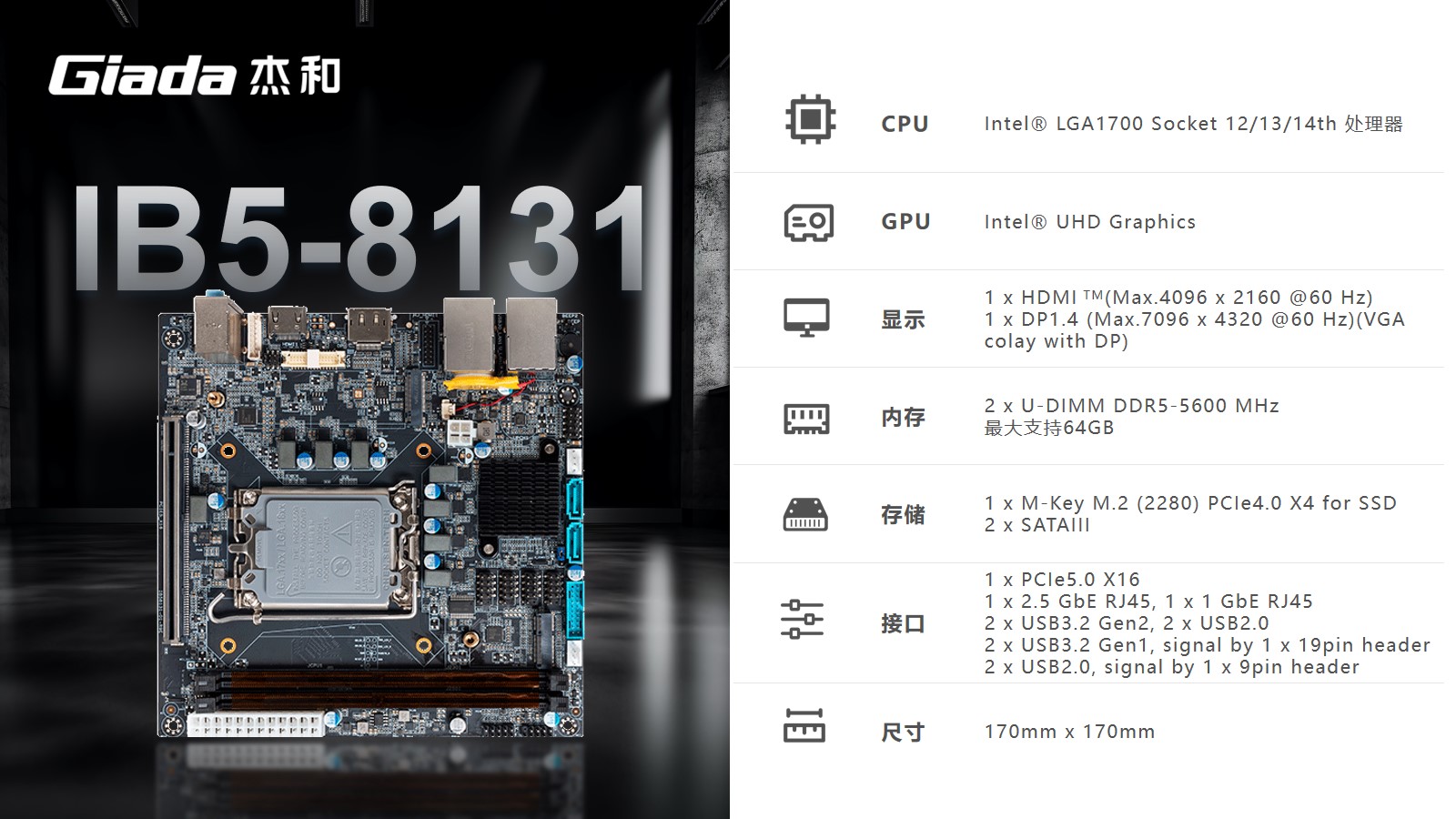 杰和Mini-ITX主板IB5-8131采用Intel® B760芯片組,支持Intel® LGA1700 Socket第12/13/14代CPU。支持1 x HDMI (Max.4096 x 2160 @60 Hz);1 x DP1.4 (Max.7096 x 4320 @60 Hz)(保留 VGA位置)。