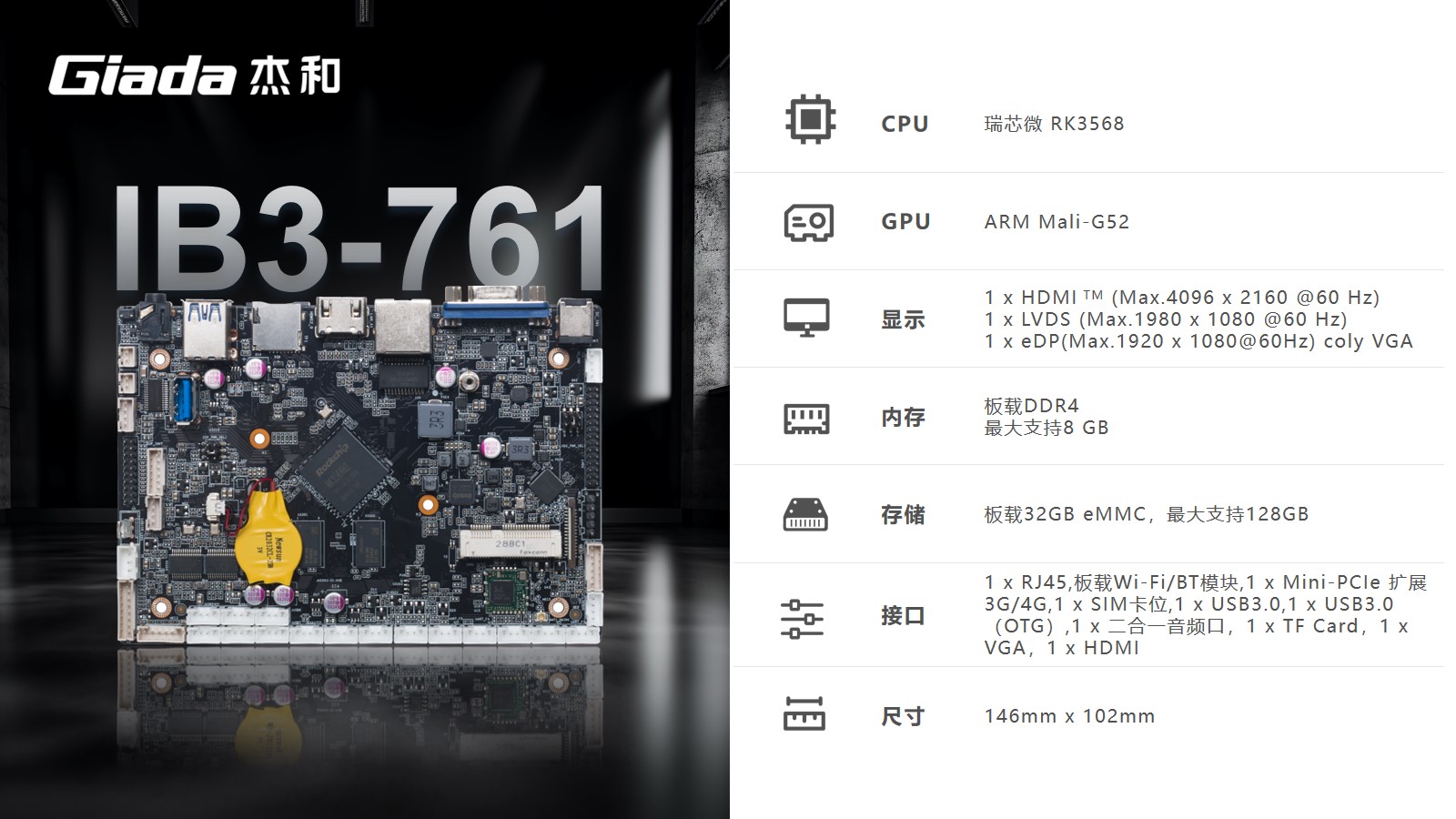 杰和工業級ARM主板IB3-761基于瑞芯微RK3568四核64位處理器開發。內置1TOPS算力的NPU,滿足輕量級端側AI計算應用。
