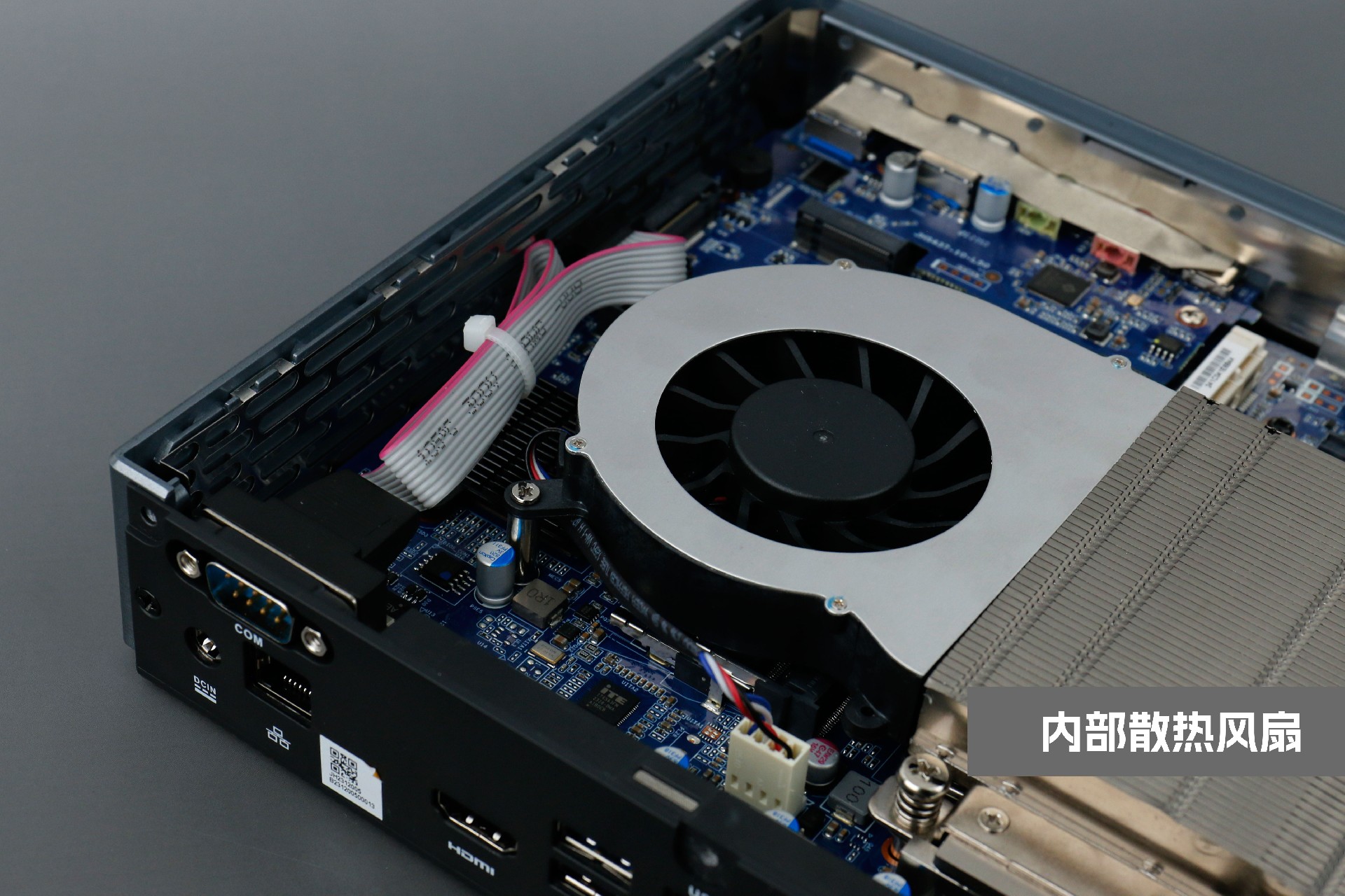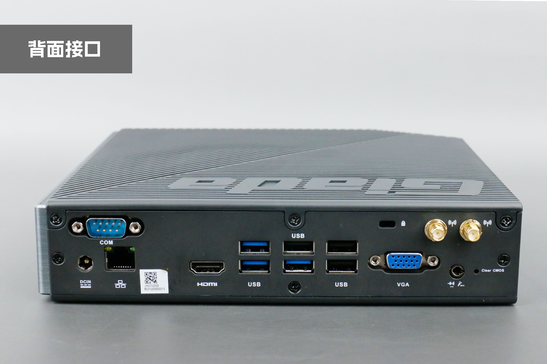 背面為1個DC-IN圓形電源接口,1個千兆網口RJ45,一個COM口,1個HDMI和1個VGA視頻接口,3個USB3.2 Gen2和3 x USB2.0接口,以及1個二合一音頻口及WiFi連接線,兼容全部主流外設,滿足更多應用拓展。