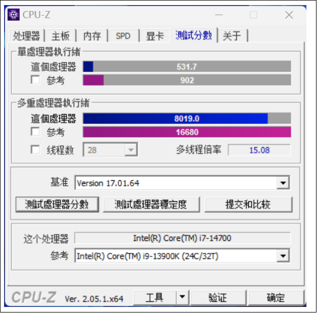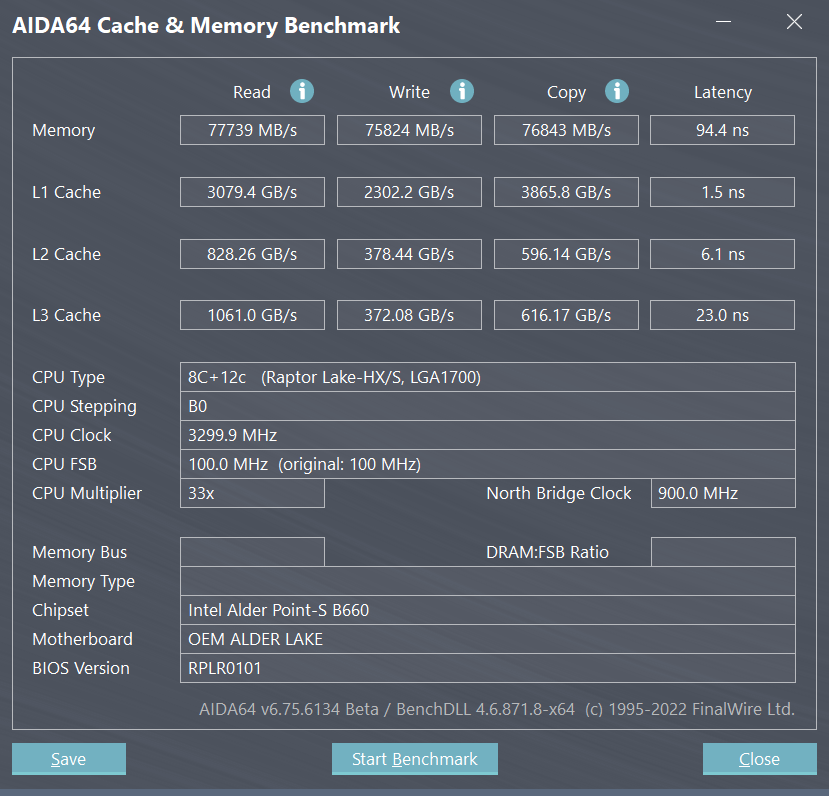 用戶關心的CPU及內存也遙遙領先,CPU實測單核得分531.7左右,多核8019.0;內存方面實測DDR5內存讀取速度為77739MB/s,寫入速度為75824MB/s,復制速度為76843MB/s。