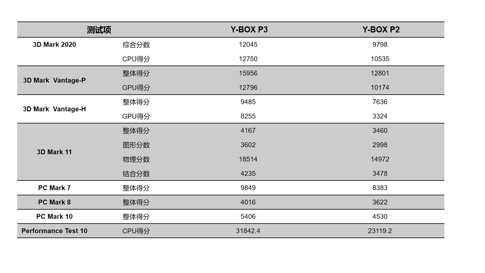 作為Y-BOX P2的迭代產品,我們選取了以下配置,將Y-BOX P3與Y-BOX P2進行對比分析,結論先行:兩款產品跑分數據表示,Y-BOX P3的跑分數據及穩定性能明顯領先Y-BOX P2。