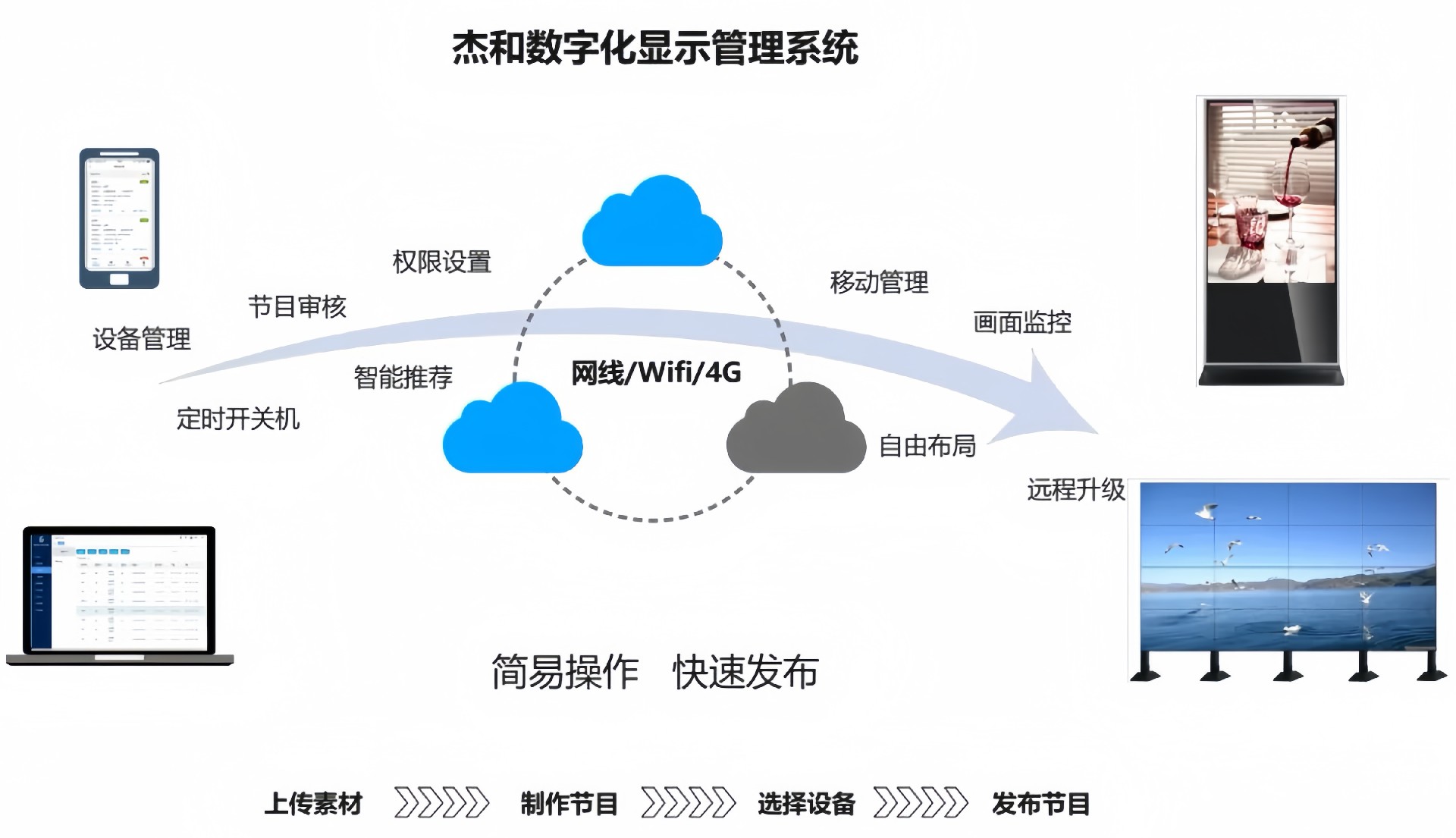目前杰和科技GDSM-ES系統覆蓋市場上多形態網絡智能顯示終端,滿足行業全產品業態需求,如廣告機、LED顯示屏、LCD拼接屏 、普通液晶電視等各種顯示終端,廣泛用于廣告宣傳、通知公告、指示引導。
