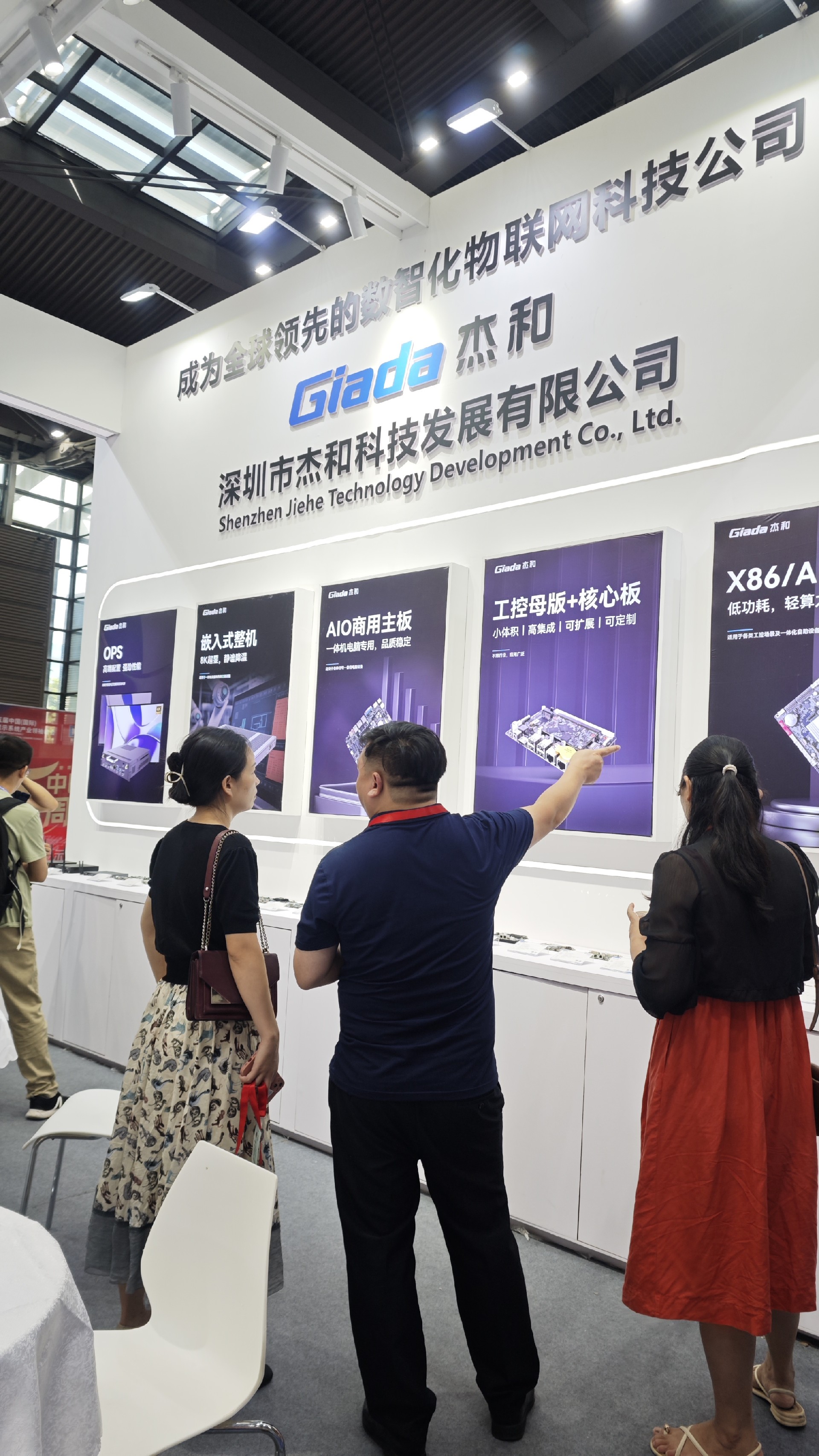 杰和科技展位放置在c位的明星產品和最新產品吸引了眾多參觀者的目光。展臺下方整齊排列著公司的產品,包括主板、嵌入式整機、OPS等,這些產品不僅適用于商業展示領域,還廣泛應用于工業、制造業和教育業等多個行業。