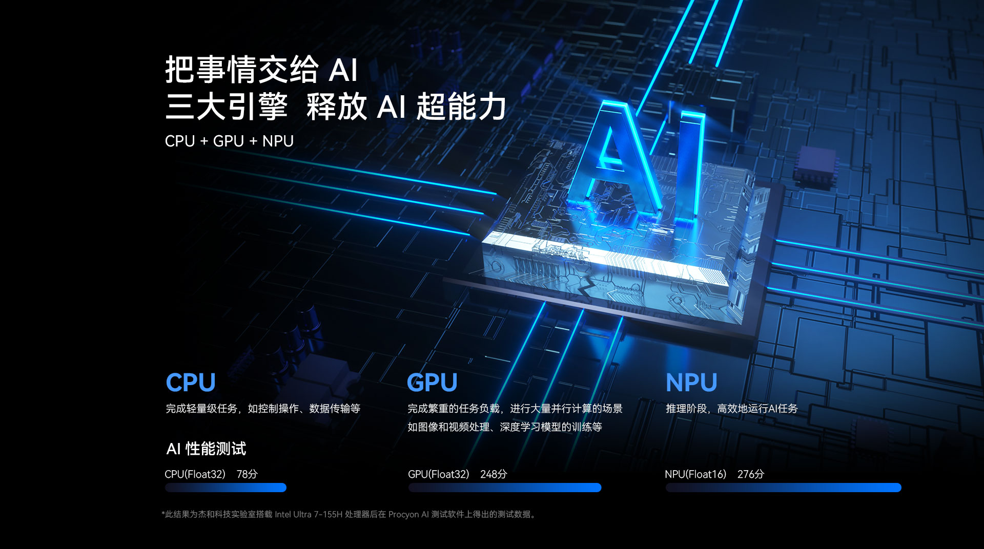 杰和科技N601搭載了Intel® Core? Ultra處理器,可選配Ultra 5- 125H或Ultra 7-155H,全新架構擁有CPU、GPU 和NPU配置。在杰和科技實驗室里,我們專門用 Procyon AI 這款 AI 性能測試軟件對搭載了 Ultra 7-155H 處理器的 N601 進行了測試。最后測試結果顯示,N601的CPU分數為78分,GPU 分數為248分,NPU分數為276分,這意味著N601在AI處理方面具有顯著優勢,能夠高效地處理復雜的神經網絡計算任務。