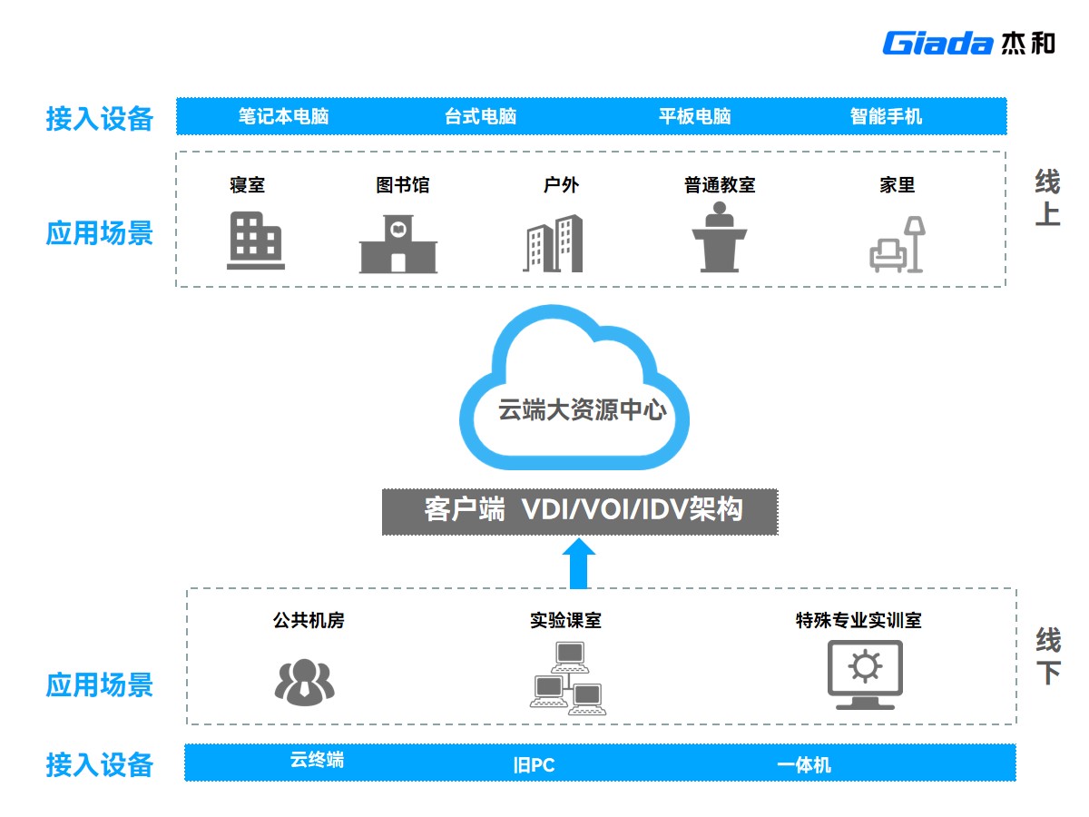 該大學最后選擇了杰和科技云端虛擬實驗室解決方案。該方案引入虛擬化技術,融合資源中心建設,將教學軟件如用友、3DMAX、CAD等軟件都在云端統一部署、更新。