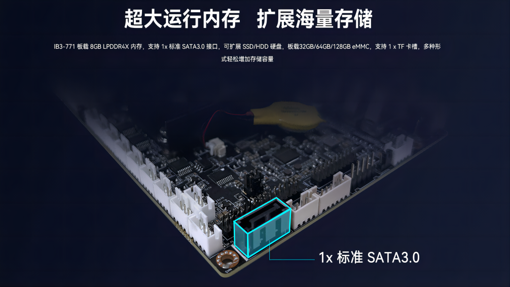 IB3-771板載8GB LPDDR4內存,支持1x標準SATA3.0接口,可擴展SSD/HDD硬盤,板載32GB/64GB/128GB eMMC,支持1xTF卡槽,多種形式輕松增加存儲容量。