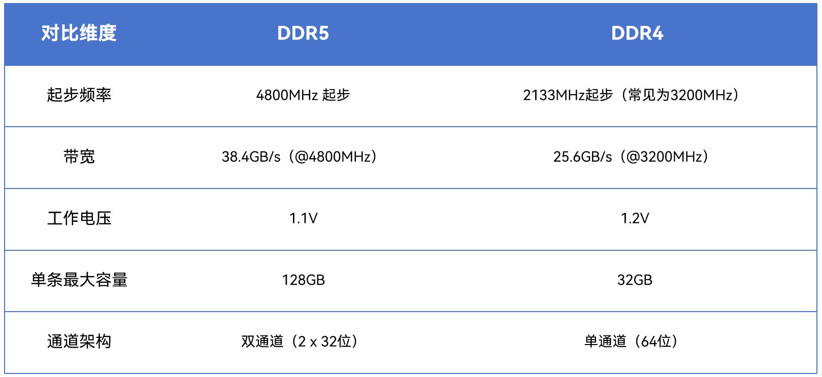 DDR4 3200MHz帶寬為25.6GB/s,DDR5-4800帶寬為38.4GB/s,DDR5內存在架構上引入了獨立雙通道設計。