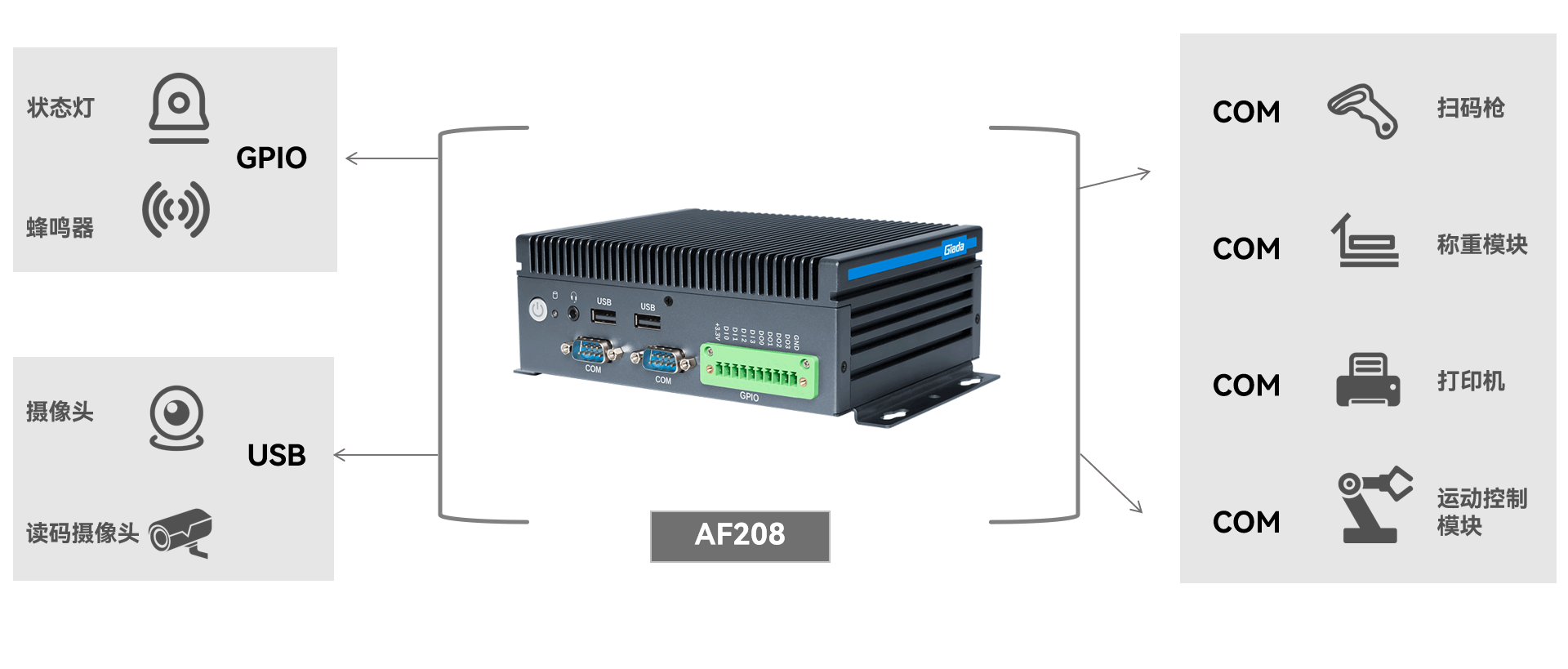 配備 4 個 COM 串口,可連接掃碼槍、稱重模塊、紅外傳感器等