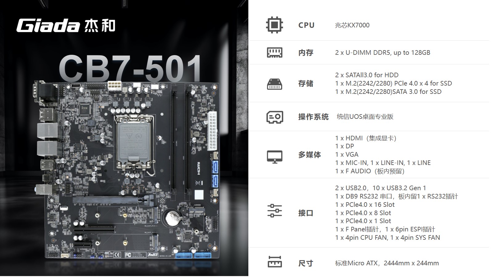搭載兆芯開先KX-7000國產處理器,基于X86架構、8核8線程,主頻達3.7GHz。支持主流雙通道DDR5內存、配備了PCIe 4.0 x16 、 PCIe 4.0 x8 、PCIe 4.0 x1 插槽,滿足多種擴展卡安裝需求。尺寸為標準Micro ATX,244 x 244 mm大小,搭配系統為統信UOS桌面版。