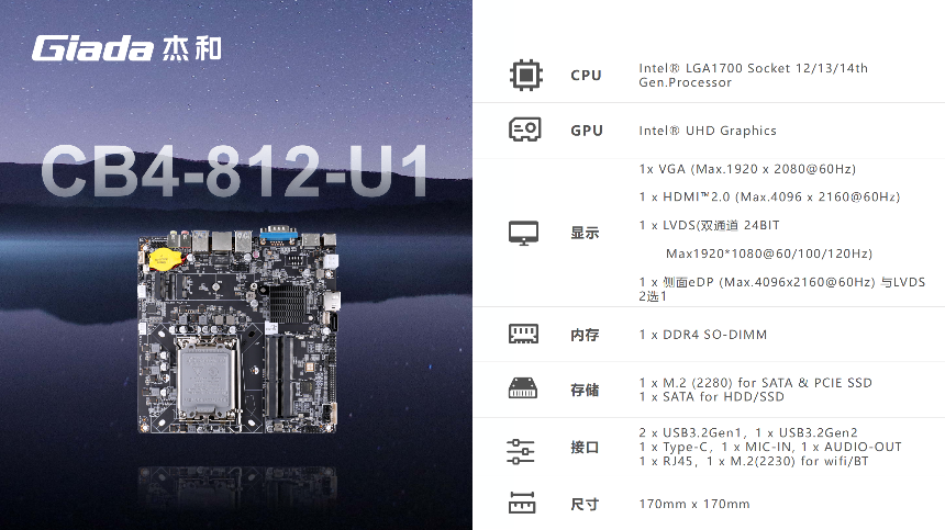 杰和科技一體機主板基于X86架構設計,具有良好的兼容性與性能表現,均采用Thin mini-ITX 170mm*170mm尺寸規格設計,在緊湊機身中實現功能集成與空間優化。接下來,我們從實際需求出發,為您提供選型推薦。