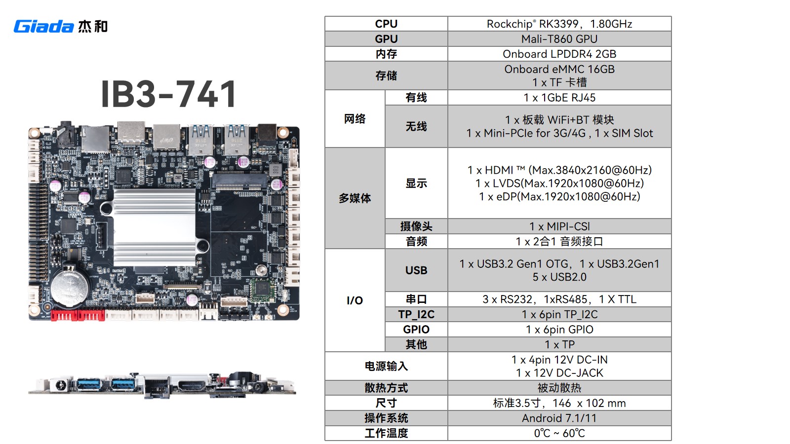 IB3-721同樣采用 RK3288 處理器,通過精簡接口進一步控制成本:保留 1GbE RJ45 網口,刪減 RJ12 ,USB 減至 5 個、TTL 串口減為 3 個 ,在滿足基礎商顯交互(如零售機、查詢機)同時,降低成本,適配功能聚焦、對成本敏感場景 。