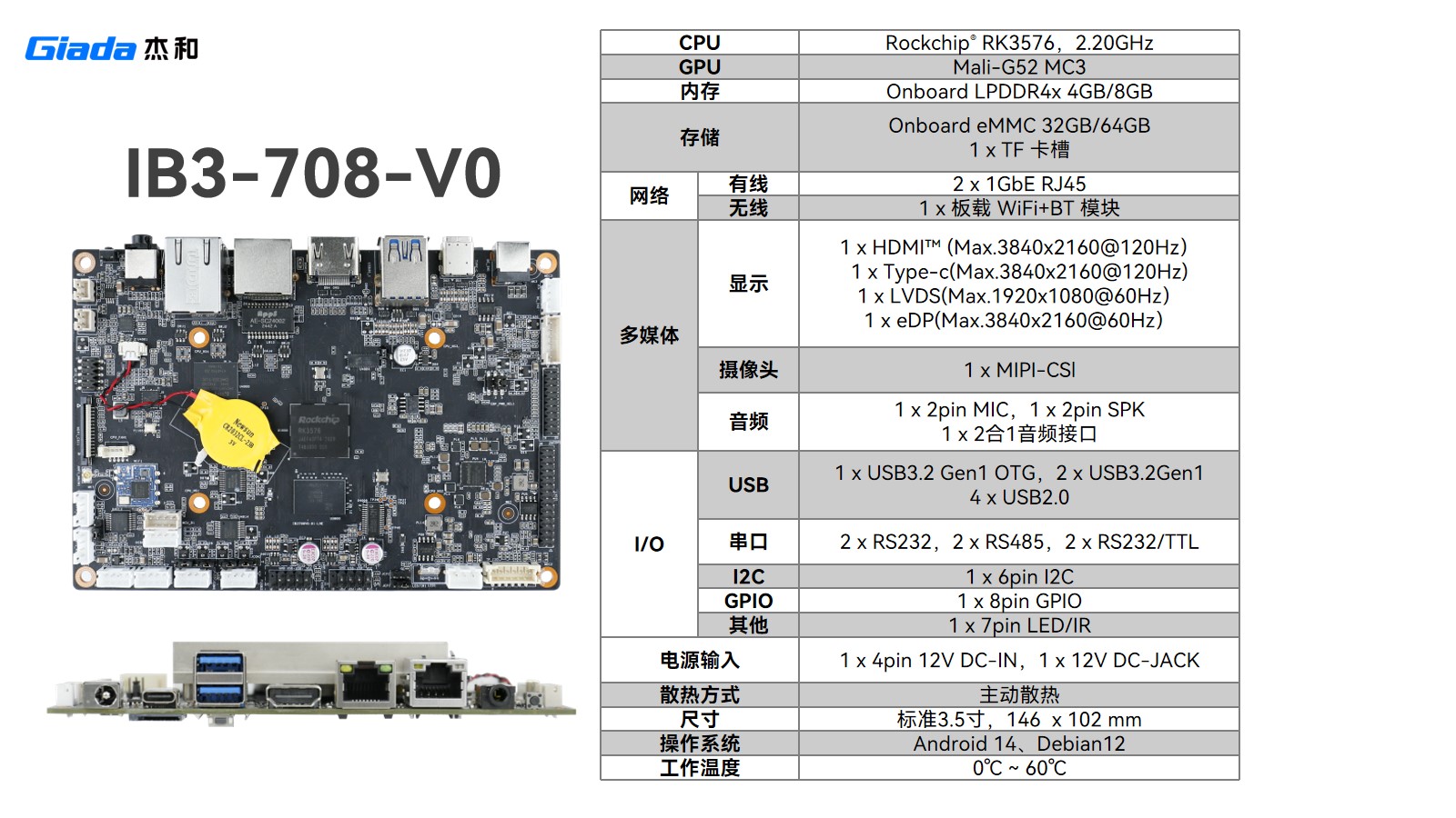 IB3-708-V0搭載了RK3576處理器,采用8nm工藝制程,在相同性能輸出下,功耗遠遠低于采用28nm工藝的RK3399。憑借其4×A72+4×A53 八核架構與 6TOPS 算力 NPU,成為現階段戶外交通監控設備的優選方案,在城市主干道十字路口監控中,其低功耗特性可支持設備7×24小時連續運行。