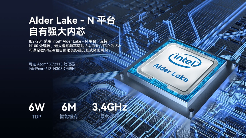 性能與功耗的平衡:IB2-281采用intel®Alder Lake-N平臺,支持N100處理器,最大睿頻頻率可達3.4GHz,如此強悍性能情況下,功耗僅為6W。某連鎖品牌全國部署超1萬臺無人零售設備,每年單電費,可節省近百萬元運營成本,這是一筆不容小覷的純利潤。