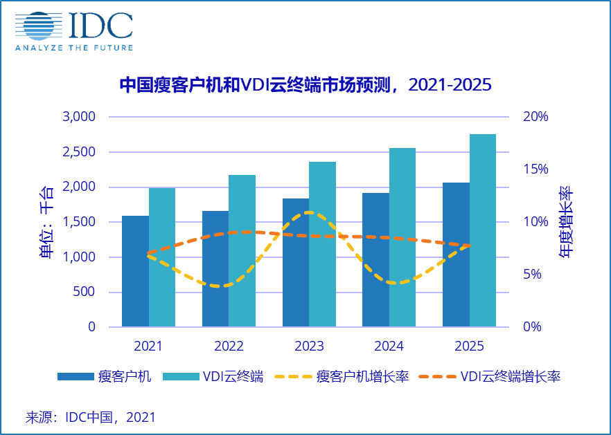 據IDC預計,至2025年,中國瘦客戶機市場規模將超過207萬臺,五年復合增長率將達到6.7%。桌面云終端VDI市場規模將突破275萬臺,五年復合增長率將超過8.5%。