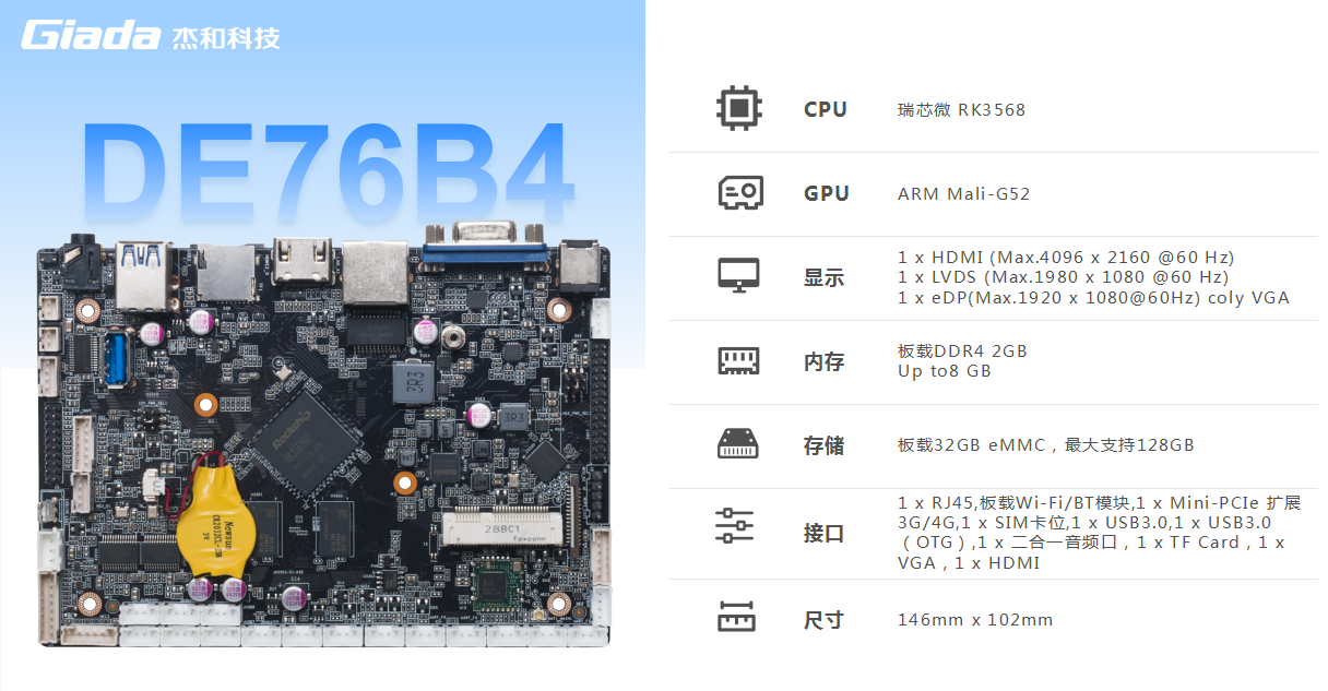杰和科技DE76B4采用瑞芯微RK3568處理器,板載DDR4內存,可實現多任務并行、更大數據集的高效處理,豐富的接口,具有性能強、內存大、集成度高、擴展能力強等特點,支持在寬溫、復雜電磁等惡劣環境下穩定運行,可廣泛應用于物聯網網關、邊緣存儲、工控平板、工業檢測、工控盒、自助終端、云終端、車載中控、機器人等行業定制市場。