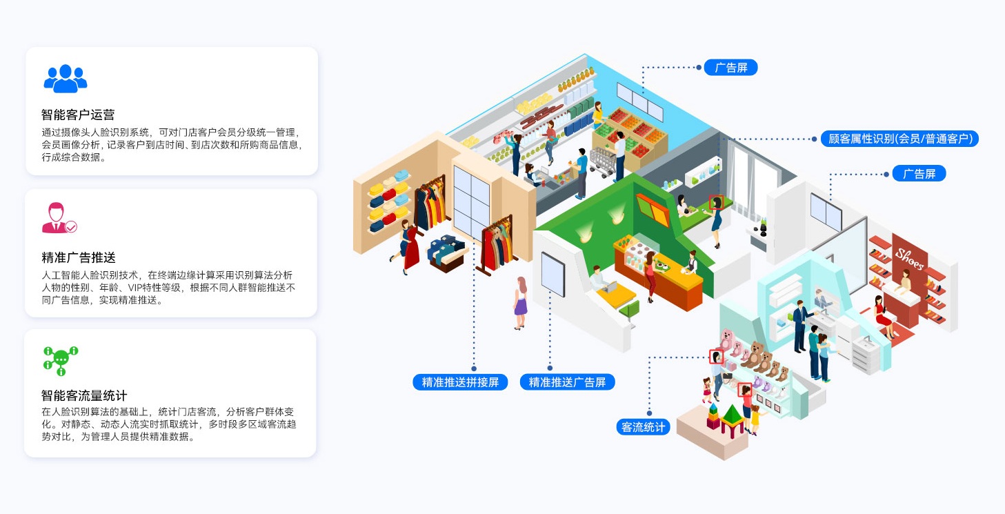 杰和智慧零售解決方案通過杰和GAM-AI視覺識別管理系統,實現推廣內容的精準推送,高效觸達,系統融合人工智能技術,采用專業的人臉識別算法,通過終端接入攝像設備與AIOT設備,自動識別不同的物體、動作和行為,形成人物畫像,提供客流統計和客群分析功能,為零售客戶提供精準的門店數字化運營管理方案。