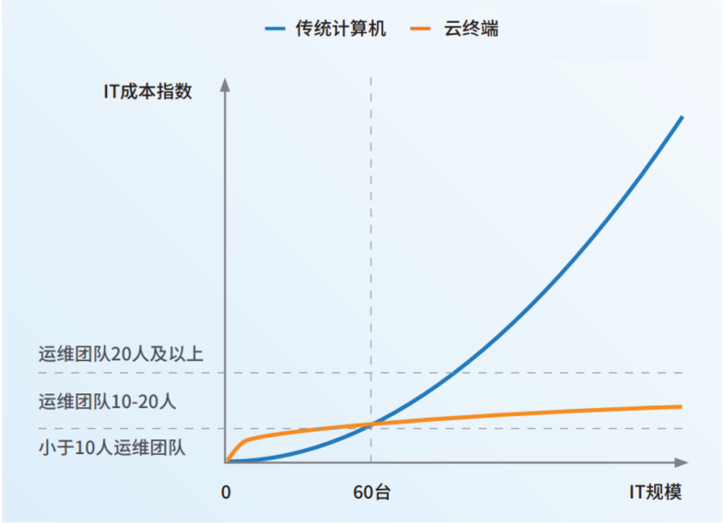 國際數據中公司IDC,基于對實際落地案例中現實情況的擬合建立模型,分析傳統計算機與云終端解決方案在不同IT規模下產生的實際成本。模型顯示,當IT規模大于60臺時,使用傳統計算機所產生的成本將超過云終端,且差距隨IT規模增長呈指數級增大。