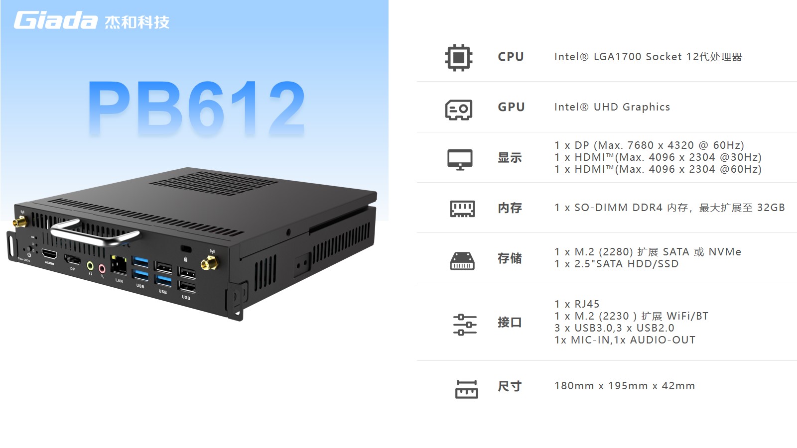 PB612是一種計算模塊插件,可用于為平板顯示器增加計算能力。PB612采用intel12代Alder Lake-S平臺處理器,可以滿足更強性能的需求,內存最大可擴容至32GB,更大內存容量及雙通道的性能加持,使得PB612可以流暢地打開運行更多的軟件,并且可實現8K視頻顯示,在課堂演示上可提高清晰度和視像傳輸效率。應用領域包括教育行業中的電子白板、教學交互智能平板、智慧電子黑板以及商業辦公中的會議平板/白板等。