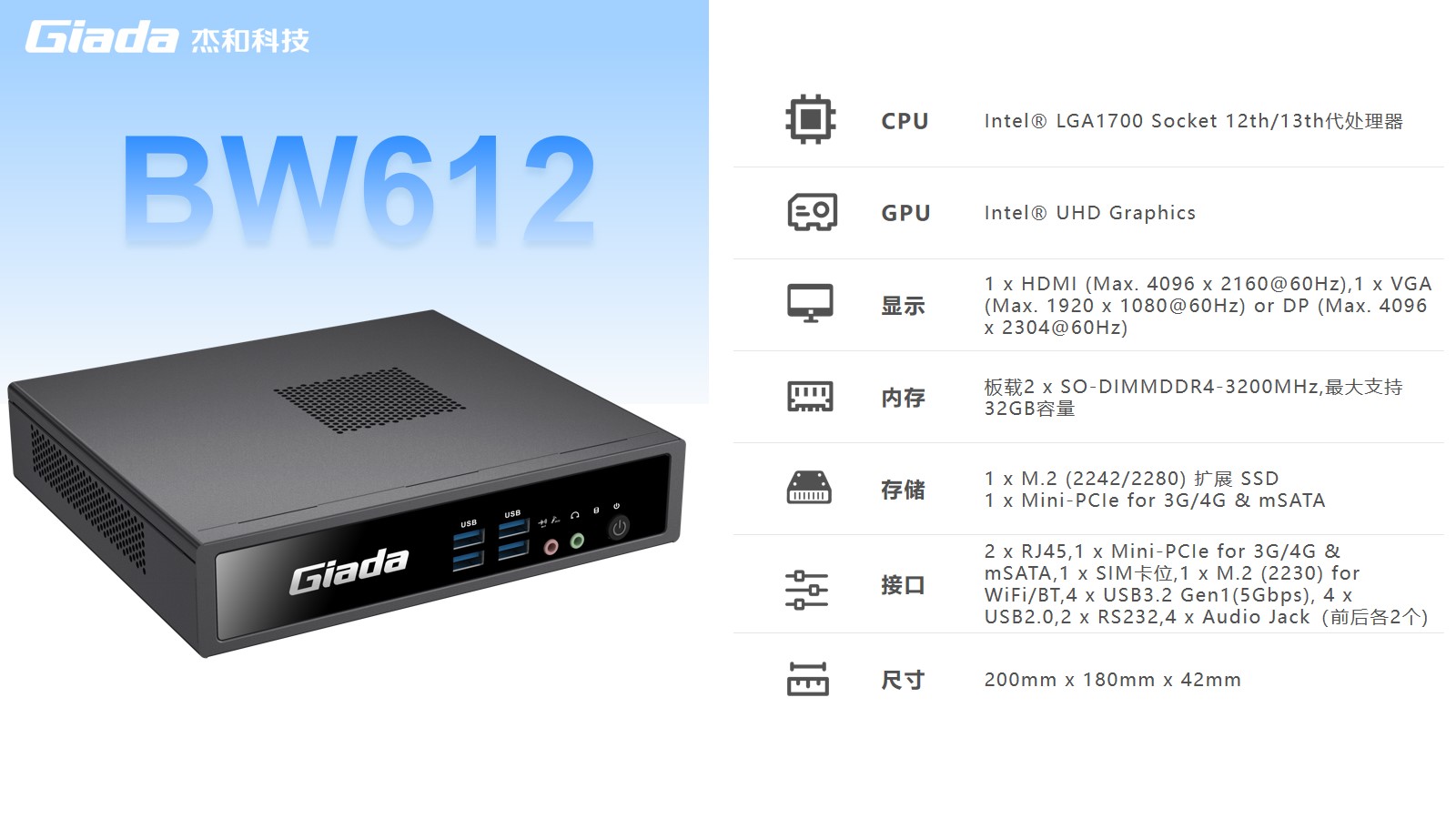 BW612采用lntel@LGA1700Socket 12代、13代處理器,比上一代 BW611計算性能提升約 23%,更強算力帶來更強體驗。主板多層板設計,配備超高品質被動元件,支持賽揚、奔騰等多種處理器定制,可選擇 Windows7、Windows10 等操作系統。具備便捷管理部署、性能強悍、擴展性強、安全性高等優勢,使用Intel UHD Graphics,支持高達4K@60Hz的分辨率雙屏輸出??蓪崿F拓展、復制、獨顯模式的自由選擇,享受清晰細膩的畫面效果的同時實現高效的多任務處理,為使用者提供高清流暢的桌面體驗。