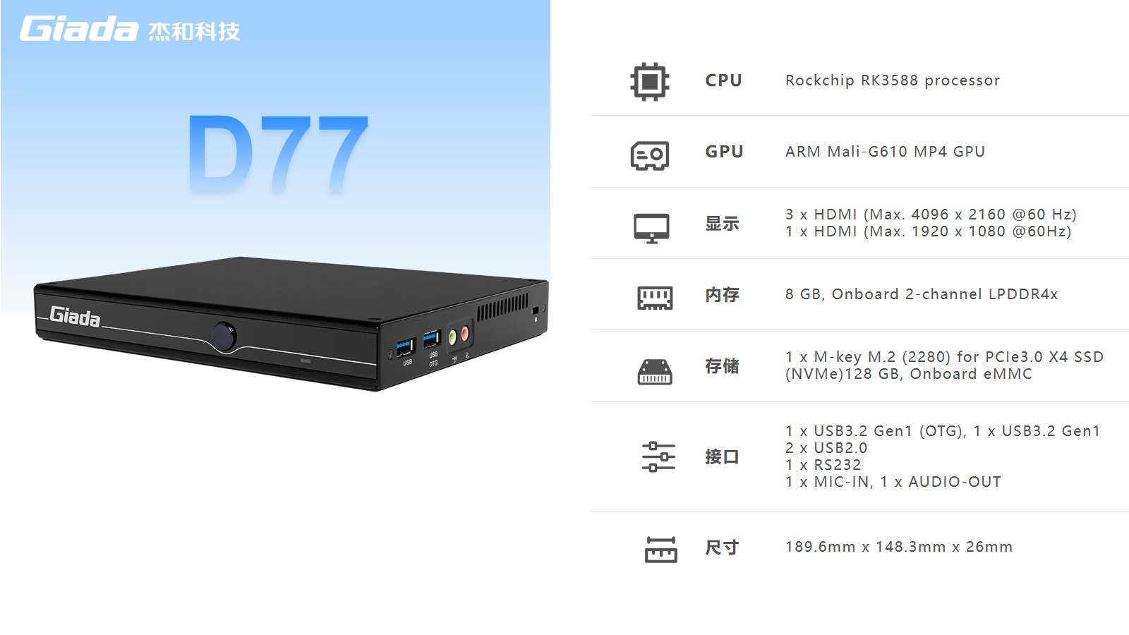 媒體播放器主要應用在大型商場、校園、戶外大屏、超市、機場等公共場所,通過大屏幕終端顯示設備,發布商業、財經和娛樂信息的多媒體專業視聽系統,以其震撼的視覺效果、強烈的畫面沖擊力和高曝光率等特點,媒體播放器已經成為成為品牌傳遞信息、展示形象的重要渠道。杰和媒體播放器D77能夠輸出4個獨立且支持4K UHD 分辨率的HDMI 屏幕,搭載八核架構,擁有6TOPS 算力的RK3588處理器,采用的ARM Mali-G610 MP4 GPU讓D77 具備極其強大的圖形性能。