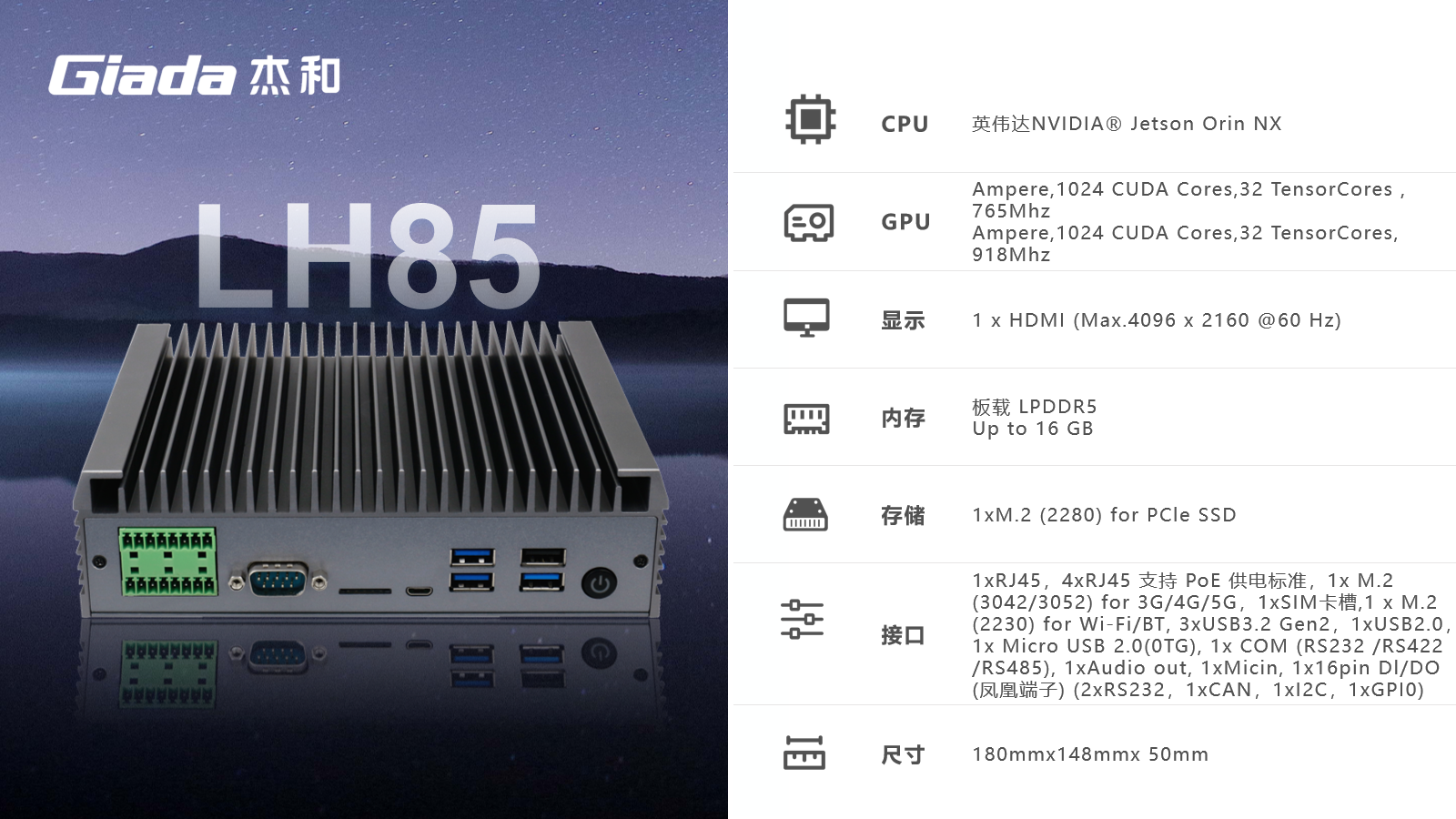 杰和邊緣計算產品LH85基于NVidia® Jetson Orin NX套件方案開發,100TOPS超強算力,具備強大的接口配套能力,是全新推出的一代針對邊緣計算的創新產品,定位于為工業控制領域客戶的AI應用提供強大的算力支持和充足的通信、控制接口保障,可廣泛應用于智能制造、機器視覺、AGV、智慧城市等領域。