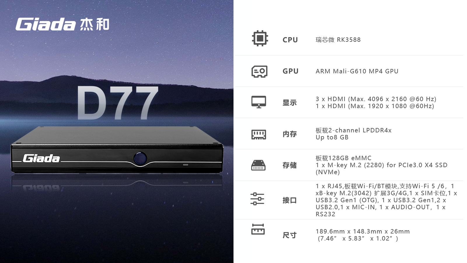 AIoT的落地場景包括智慧工業、智慧零售、智慧社區、智慧城市、智能顯示、醫療健康等領域,在實際落地時,對物聯網硬件設備的AI算力、數據運算、存儲能力,穩定性及可擴展性能等提出更高要求,Giada杰和科技作為行業領先的物聯網數智化技術服務商,深入布局AIoT領域,推出AI產品系列,包括3.5寸主板、嵌入式整機、邊緣計算盒子等,全方位覆蓋了入門級到高性能級,滿足不同應用場景的需求,為用戶賦能。
