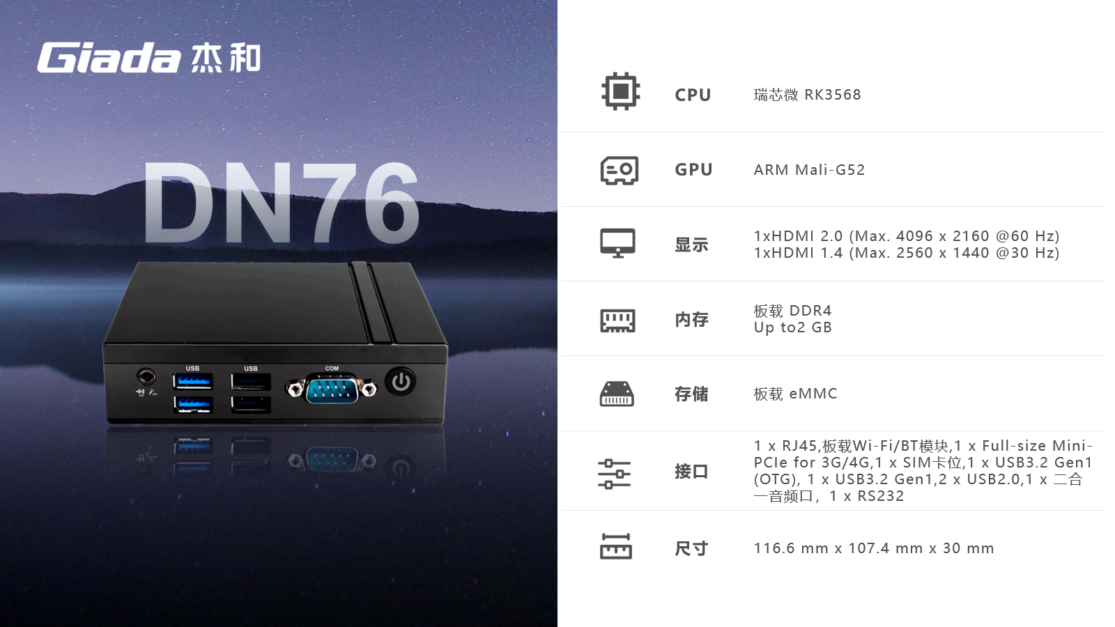 杰和媒體播放器DN76采用瑞芯微RK3568 ARM嵌入式方案,作為一款超緊湊的安卓播放器,內置一個獨立的NPU,計算能力為1TOPs,可用于輕量級AI應用程序,支持HDMI雙顯,優秀的散熱設計,超高性價比,得到廣大用戶的喜愛,可以廣泛應用于商業顯示、智能車載、安防領域和邊緣人工智能等場景。