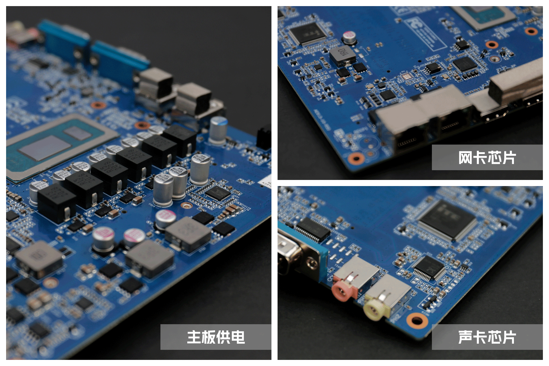 杰和AE613主板的供電相關部分都覆蓋了銀色導熱膠,我們把導熱膠撕下來,可以看到主板采用的是4+2相供電,在主板兩側的接口附近,都分布了相關的芯片,音頻接口附近可以看到一個經典的“小螃蟹”ALC897 聲卡芯片,在雙網口RJ45附近有兩個網卡芯片,分別是Intel I210IT和Intel I219LM(支持 Vpro),整體做工比較扎實,元器件排列也很規整。