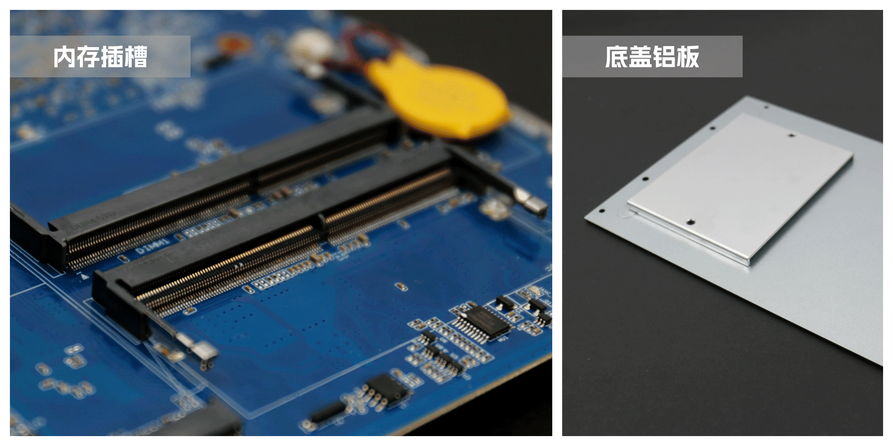 杰和AE613主板的背面面積占比較大的是內存插槽,采用雙通道兩條內存槽設計,最大支持容量可達64GB,最高支持DDR4-3200MHz頻率,內存與底殼接觸面裝備了一塊散熱鋁板用于高效散熱。