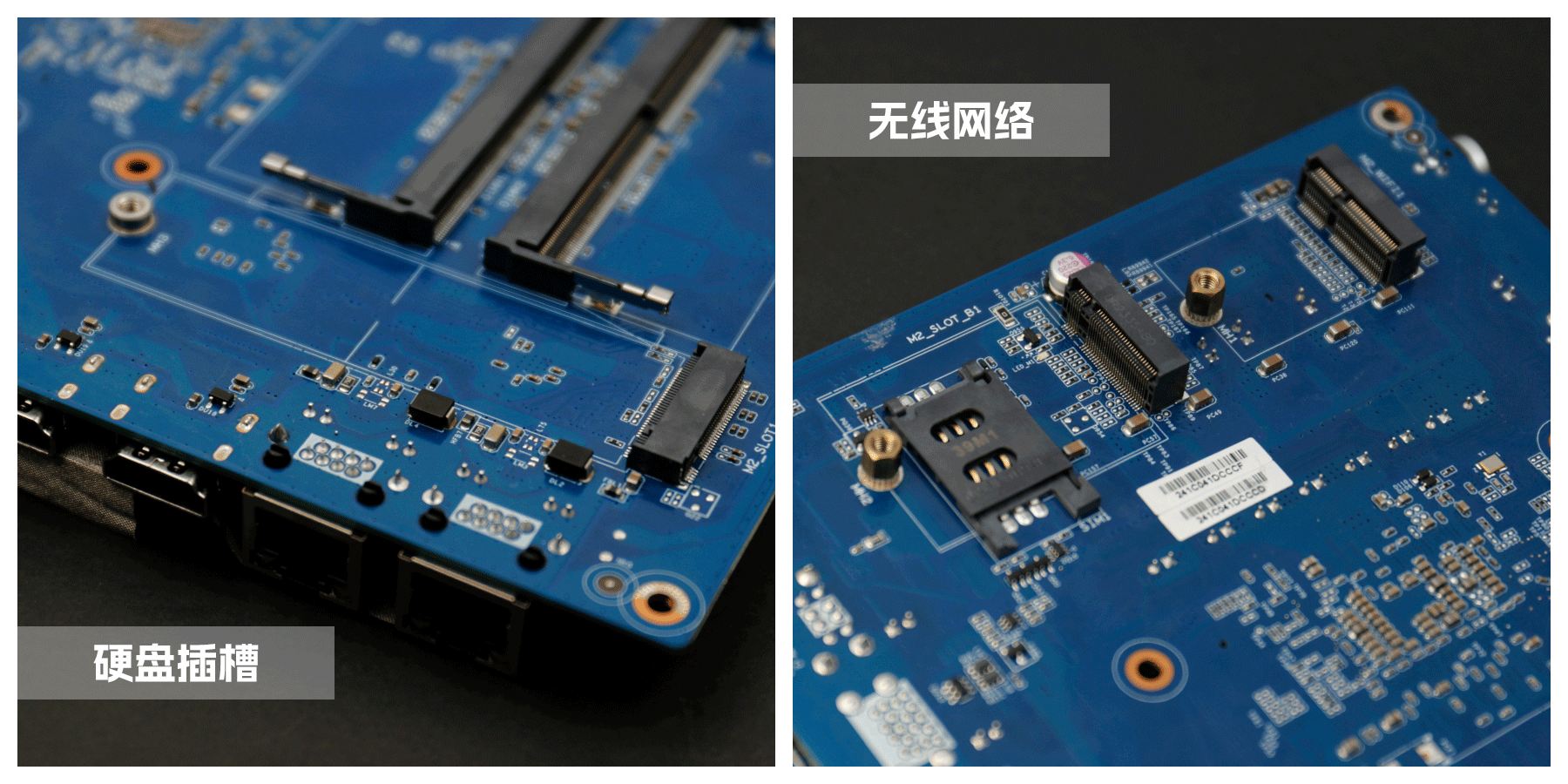 杰和AE613主板上配備了 1個 M.2 固態硬盤位,接口規格為 PCIe4.0 標準,匹配標準的 2280 規格硬盤。一側還有兩個M.2接口,一個是支持2230長度的E-Key WIFI/BT模塊插槽,支持Wi-Fi 5/6/6E網絡;一個是支持3042長度的B-Key WIFI/BT模塊插槽,支持3G/4G網絡,還有一個SIM卡槽。