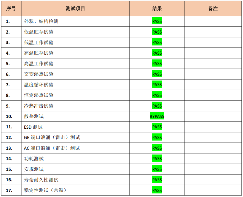 通過七項測試,實驗前后外觀無異常變形,無噪音增加,在 BIOS、OS 下硬盤、DIMM 沒有掉失,且槽位號正確,電源、硬盤、網卡等指示燈顯示正常,壓力軟件運行正常,沒有出現性能異常現象,所有接口功能正常,測試通過。