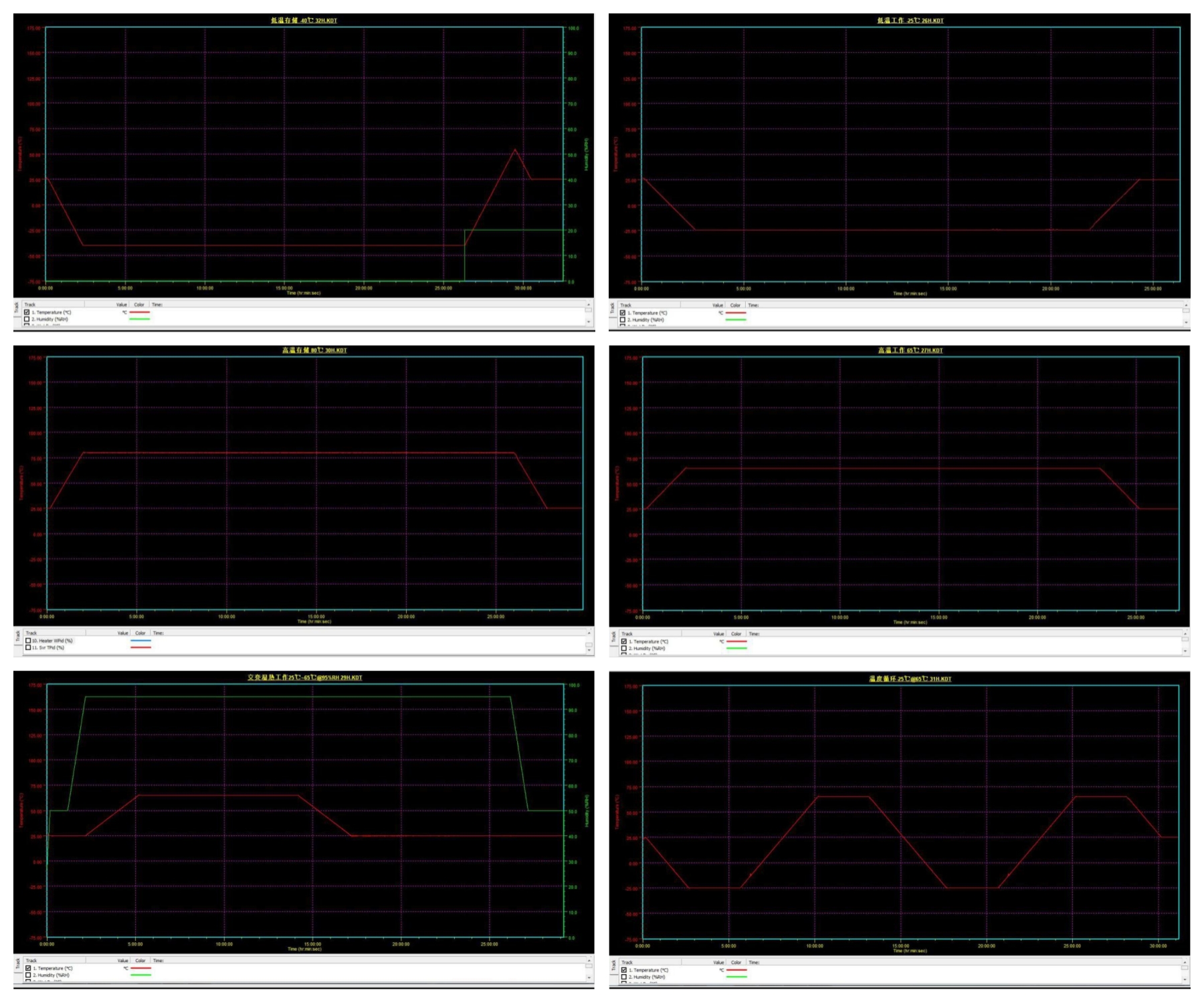 氣候環境中對杰和AE613會造成影響的主要是溫度和濕度,接下里我們需要在恒溫恒濕箱中,通過設定溫度控制箱中的溫度,對AE613進行七項測試,測試順序為:低溫貯存→低溫工作→高溫貯存→高溫工作→交變濕熱→高溫循環→恒定濕熱存儲。