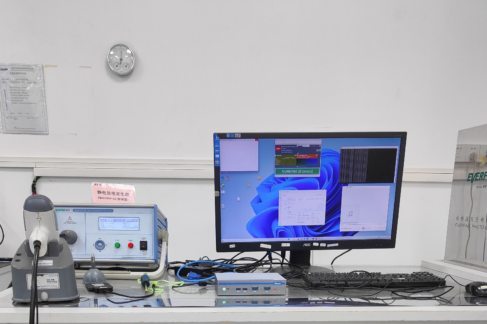 杰和AE613的靜電測試,是通過專業設備靜電放電發生器進行測試,測試接口收到外部的靜電后,是否會影響到機器的正產運行。在實際操作中,對每個接口測試點采取正負極各 25 次連續單次放電(時間間隔 1.5 秒),對于涂漆是絕緣層、非導電(例如,塑料)連接器內可接觸的點只進行空氣放電。試驗結束后,AE613能正常工作,無可察覺的通信質量的降低,無控制功能的喪失或存儲數據的丟失,并且保持通信連接,測試通過。