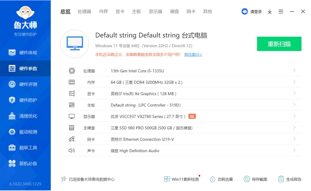 面是魯大師識別的杰和AE613硬件參數詳情,我們進行跑分測試的核心三大件選擇的是13th Gen Intel(R) Core(TM) i5-1335U @1.30GHz處理器,Intel(R) Iris(R) Xe Graphics顯卡,三星 32GB*2 DDR4 3200MHz內存,三星SSD 980 PRO 500GB(500 GB/固志硬盤),下面我們來看詳細的跑分數據。