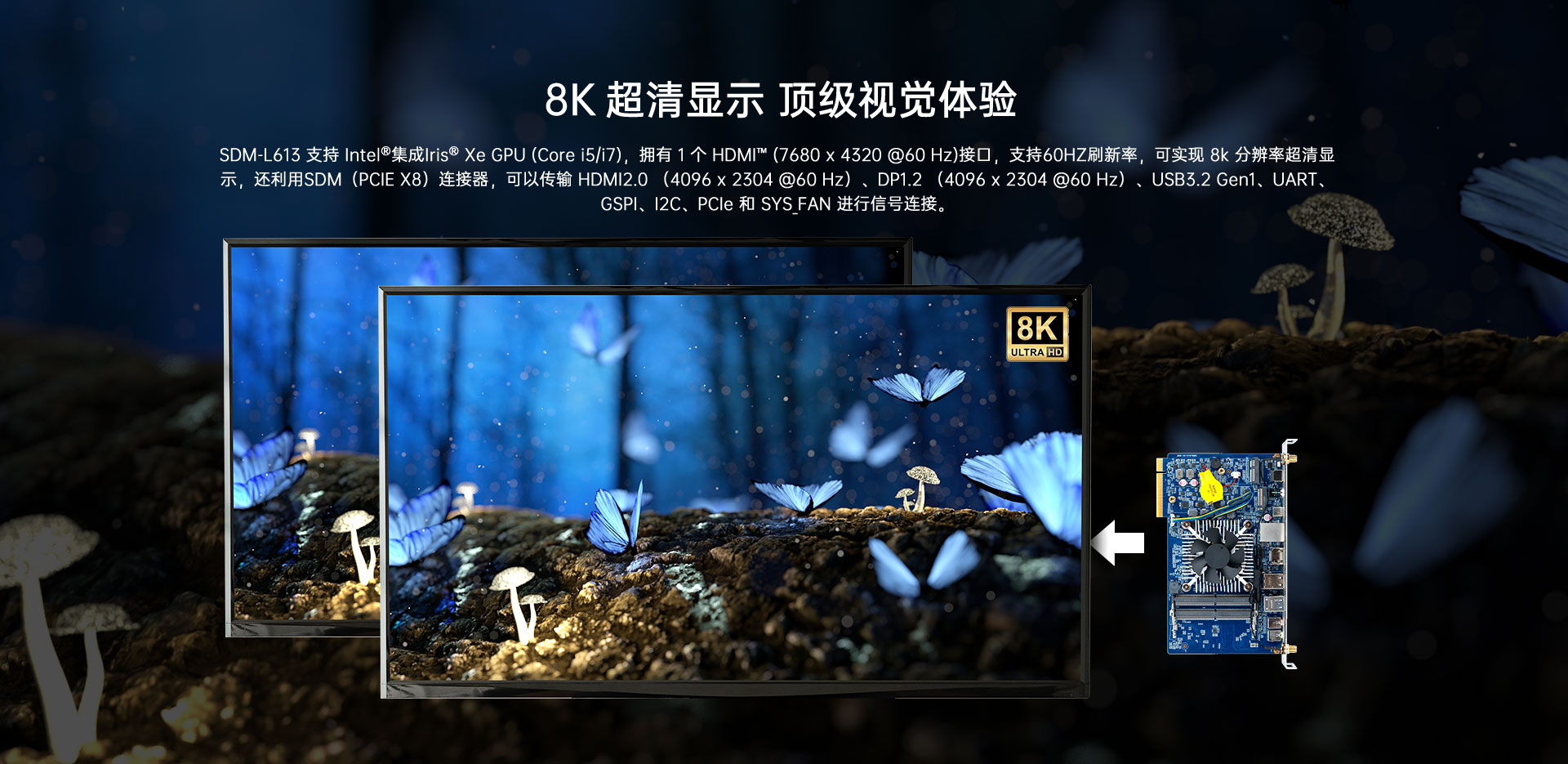 1個HDMI ?(7680 x 4320 @60 Hz)顯示,PCIE x8 Edge Connector支持8K輸出,1個HDMI ?(Max. 4096×2160@60Hz)1 x DP(Max.4096×2160@60Hz)