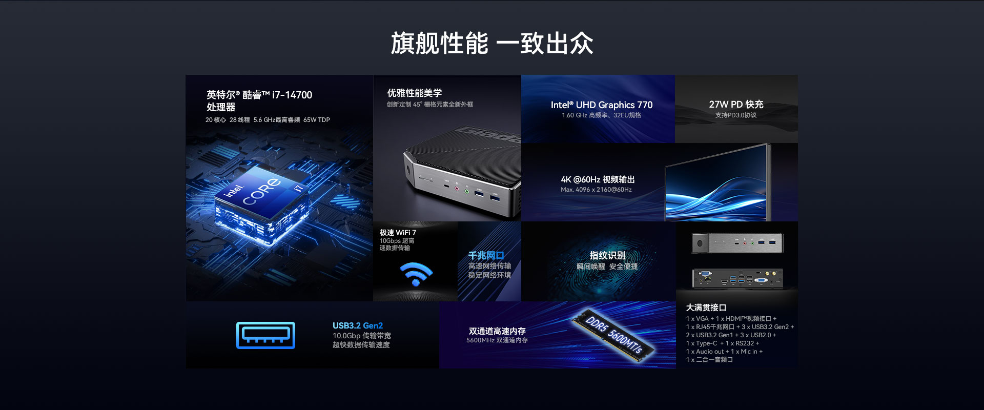 | I/O | 接口 | 3 x USB3.2 Gen2 ,2 x USB3.2 Gen1, 3 x USB2.0,1 x Type-C 1 x RS232 |