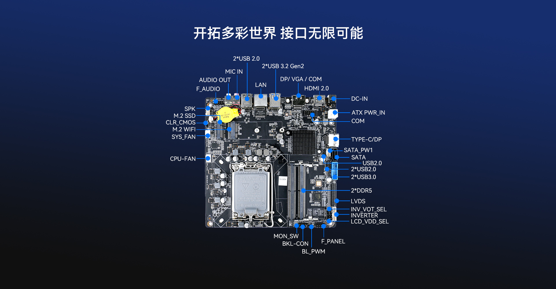 | 內部I/O | 接口 | 1 xM.2(2242/2280) for(pcie xsata) SSD 1 x M.2(2230)for WIFI/BT 2 x USB3.0 插針,3 x USB2.0 插針 1 x LVDS 30pin,1 x LCD_VDD_SEL 6pin 1 x Speaker 4pin,1 x F_Audio 9 1 x SATA for HDD/SSD, 1 X CLR_CMOS 按鍵 1 x MON_SW 5pin,1 x SYS_FAN 4pin |