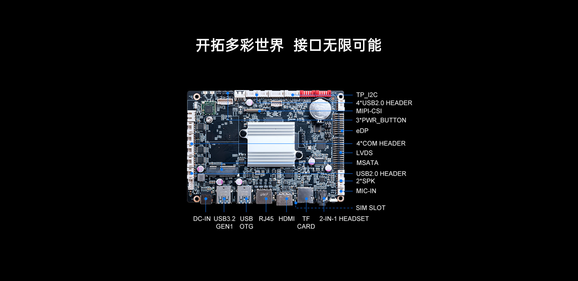 | 外部I/O | 接口 | 1 x HDMITM(Max.3840 x 2160 @60 Hz) 1 x USB3.2 Gen1 OTG, 1 x USB3.2 Gen1 1 x RJ45 1 x Full-size Mini-PCIe for 3G/4G,1 x SIM Slot,板載Wi-Fi/BT 1 x 2-IN-1 Headset (AUDIO-OUT & MIC-IN) |